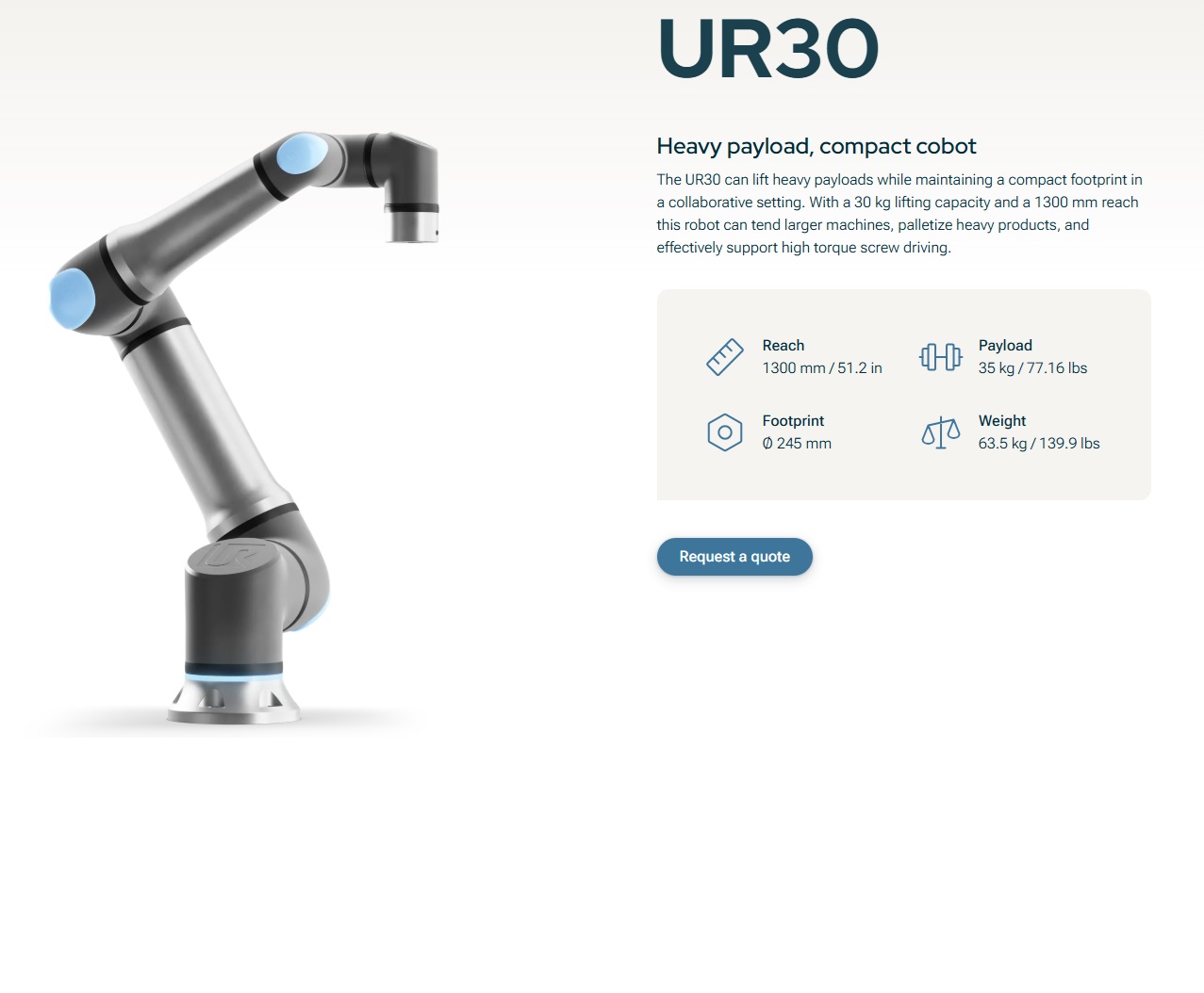 UR30 מבית Universal Robots הוא קובוט חזק ומהיר. המיועד לספק פתרונות אוטומטיים בתעשיות הדורשות עוצמה ויכולת עבודה עם עומסים גבוהים. עם קיבולת העמסה של 35 ק"ג ויכולת הגעה של 1300 מ"מ. ה-UR30 מציע פתרונות מצוינים במשימות הרמה, טעינה ואריזה של חלקים כבדים.